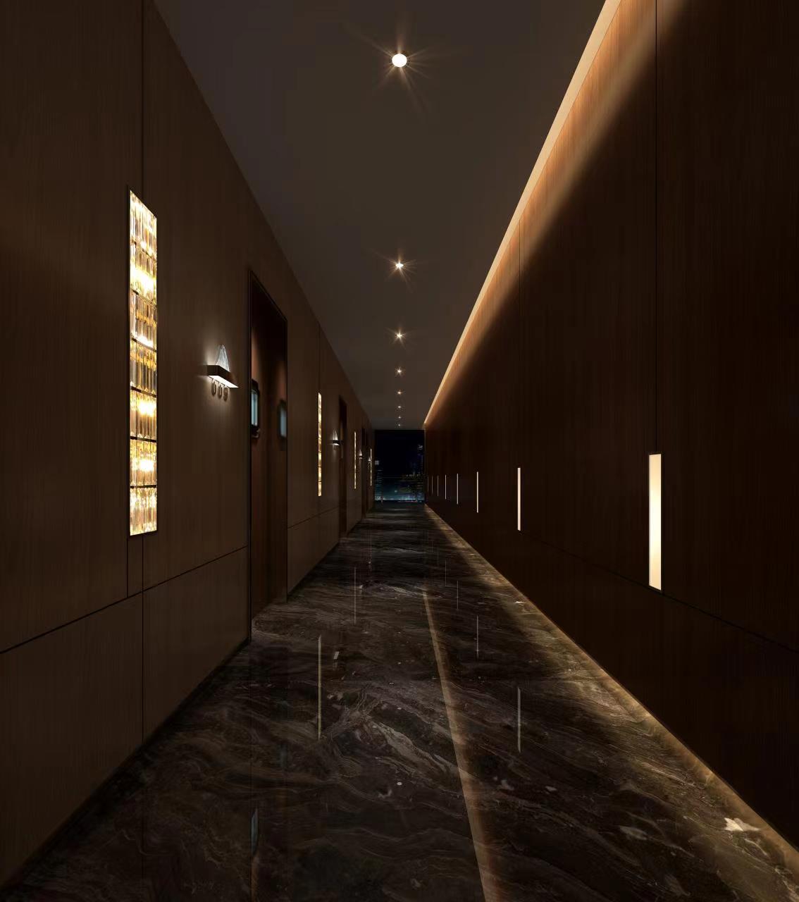 兩側(cè)木質(zhì)裝飾的平整墻面、純粹的白色吊頂、光滑的大理石地面,三者佐以柔和的暖黃燈光,將一整條修長的走道塑造成曲徑通幽的景象,同時(shí)襯托出餐吧簡潔大氣、不落俗套的氣質(zhì)。